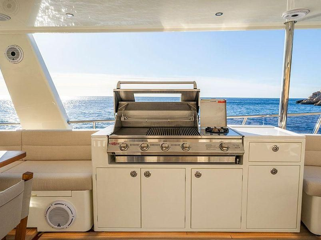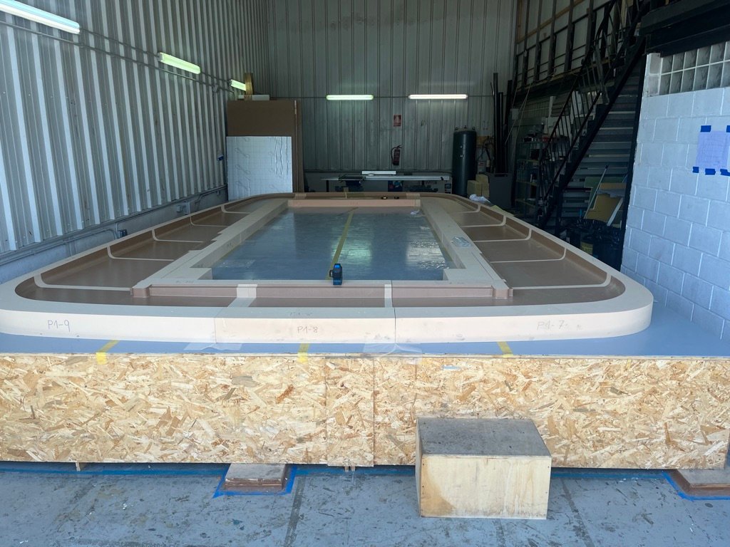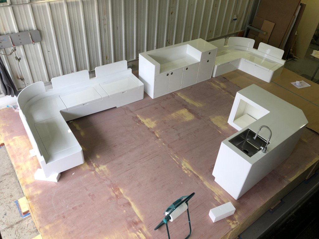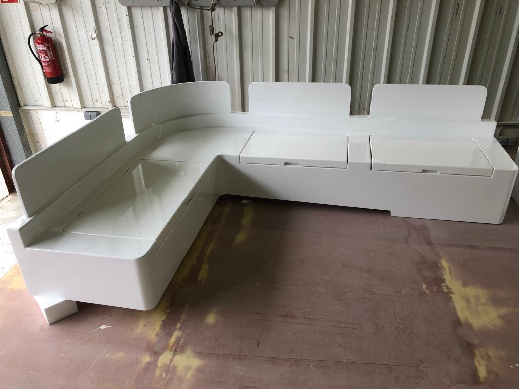 Our journey began in 2021 with the redesign of the flybridge furniture. After an extensive and collaborative design phase, where we engaged thoughtfully with the owner to refine the details, we finalized the designs and moved into production. This phase included crafting two sofa coach units, a sink unit, and a BBQ unit. We utilized CNC machined MDF shuttering and loose tooling, ensuring each piece met our high accuracy standards. This method allowed for smooth finishes and minimized additional fairing and painting work.